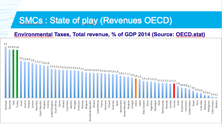 Les revenus issus des taxes environnementales varient entre pays Méditerranéens. En Tunisie ils étaient seulement de 1.16% du PIB en 2014, ce qui demeure insuffisant en comparaison de la Slovénie (3.9% du PIB, pour un PIB similaire à la Tunisie) ou du Maroc (1.72% du PIB). Parmi les pays de la région, la Turquie est le pays où le revenu des taxes représentait la plus grande part du PIB (3.83%), bien que ce pays ne soit pas comparable en termes de démographie ou de tourisme (la taille du pays compte dans les recettes fiscales).
