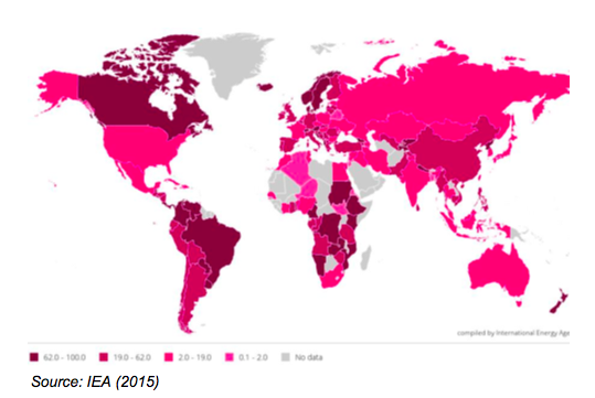 La production d’électricité à partir d’énergies renouvelables a doublé entre 2008 et 2015, mais sa part dans la production totale d’électricité à déclinée à cause d’une croissance de la production d’électricité issue d’énergies fossiles supérieure à celle issue d’énergies renouvelables.