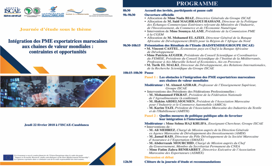 FEMISE et l’Institut de la Méditerranée (IM) ont co-organisé une journée d’étude sur « Intégration des PME exportatrices du Maroc aux chaines de valeur mondiales » le Jeudi 22 février 2018 à l’ISCAE, Casablanca, Maroc.