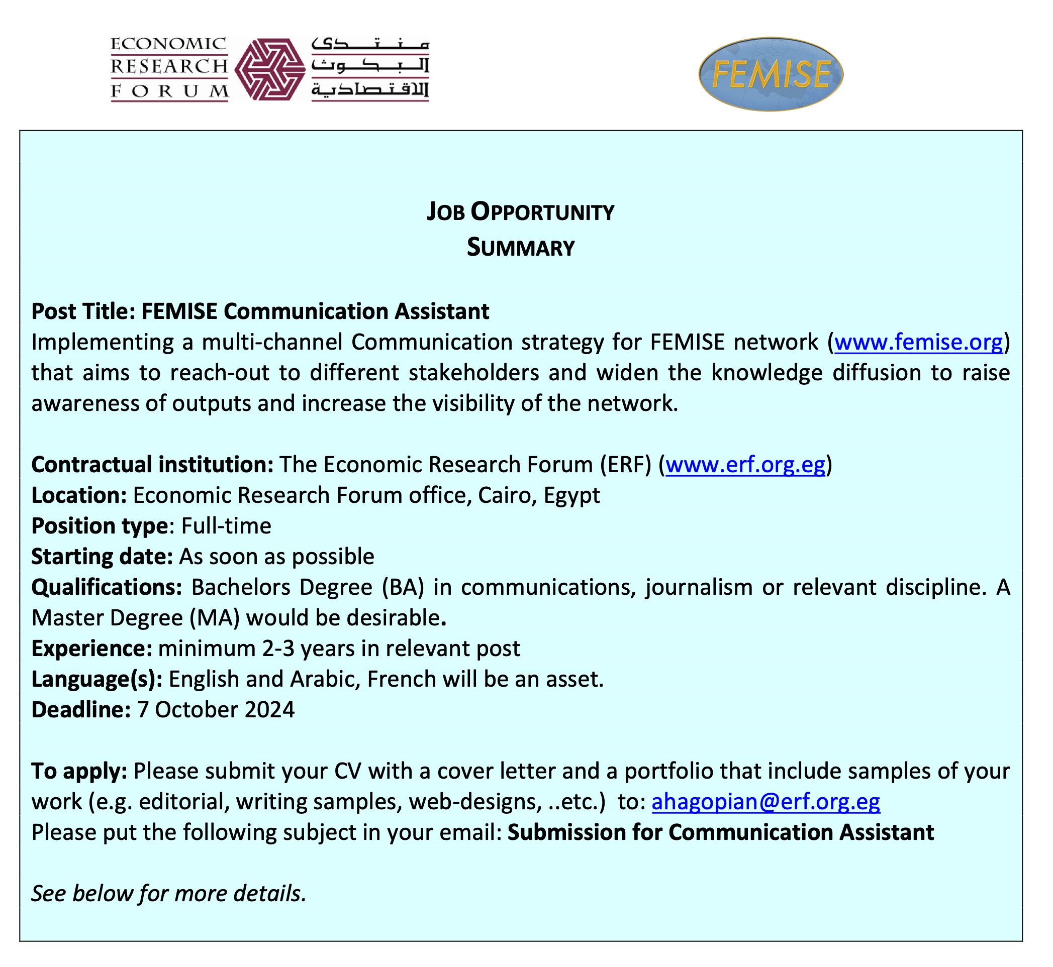 To apply: Please submit your CV with a cover letter and a portfolio that include samples of your work (e.g. editorial, writing samples, web-designs, ..etc.) by the 7th of October 2024 to: ahagopian@erf.org.eg. Please put the following subject in the your email: Submission for Communication Assistant