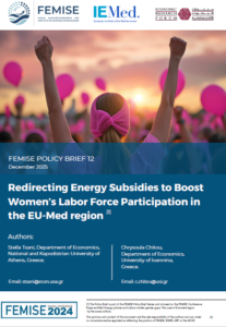 This policy brief examines the relationship between fossil fuel subsidies and female labour force participation in the Euro-Mediterranean region, drawing on empirical evidence from 27 EU countries and 7 South Mediterranean countries over the period 2010–2022. Using quantile regression techniques, the analysis captures how the effects of energy subsidies differ across countries with varying levels of women’s labour market participation.