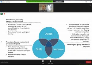 Accordingly, when thinking about our duties towards future generations, we need to acknowledge that the issue of transportation and mobility and responding to Covid-19 is related to the question of what the future of our cities should look like. This was the theme of the second presentation. In this context, an Avoid – shift – Improve paradigm (ASI) to mitigate the impact of the Covid in the transport sector was highlighted; first we need to start avoiding unnecessary travel or overdependency to travel. A second dimension would be to shift to clean and fast modes of transportation and finally we would need to improve quality and performance of transport. In fact, argued the authors of the brief, if we want to make use of the opportunities offered by this pandemic, we must also the promotion of compact and human-centered cities, without which we will not emerge stronger from this crisis. Indeed, environmental friendly policies should work better than in the past, as we are now more environmentally aware and we have a better understanding of the fact that environmental problems are imminent and not far-off. In other respects, the distributional impact of climate change policies and the implication in terms of inequalities should be taken into account in future research. .(Armin Wagner, access to presentation and Medbrief. No.2)