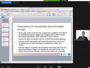 In the final Country-specific implications’ session, the cases of Egypt, Tunisia and Lebanon were presented, showing the importance of properly managing the crisis implications on households and on vulnerable groups, as well as the main economic challenges faced by these countries. A set of measures that should be implemented were also proposed for each country. With regards the first paper, it was stated that previous economic reforms in Egypt have relied on macroeconomic policies that included limited inclusive growth measures, and in response to the Covid Crisis the government prioritized businesses over households. Therefore, it is crucial for governments on the short run to increase cash transfers to the vulnerable and consider redistributing support from businesses to households, while on the long run, there should be a radical change in the government’s policy with increased focus on training and in preparing people for digital transformation (Hussein suleiman, access to presenation and Medbrief no. 4).