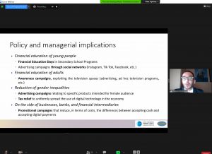 The first session addressed financial reform strategies for Med countries suffering from the consequences of the pandemic and from pre-existing international financial instability. It also focused on the role digitalization can play in the Med region, which is marked by a large divide between North and South and by sizeable gender differences in financial education. During this session, researchers emphasized on how strengthening the degree of Digital Financial Education of individuals can accelerate the digital transformation of firms during the pandemic. This can, in turn, contract the socio economic effects of the crisis in the southern Mediterranean, a region where cash is still very popular as a means of payment. (Marco Trinchera, access to the presentation and MedBrief no.5).