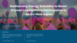 Ce policy brief situe la réforme des subventions aux combustibles fossiles à l’intersection de la transition énergétique, de l’égalité de genre et de la croissance inclusive. Il souligne la nécessité d’évaluer les politiques énergétiques non seulement sous un angle environnemental ou macroéconomique, mais aussi au regard de leurs implications pour l’autonomisation économique des femmes et leur participation au marché du travail dans la région euro-méditerranéenne.