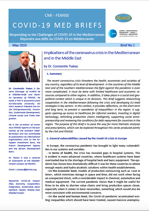 La récente crise du coronavirus menace les santés, les économies et les sociétés de tous les pays. Dans les pays du Sud et de l’Est de la Méditerranée la lutte contre la pandémie est encore plus compliquée. Une coopération et des stratégies UE-Med dans des secteurs clés sont nécessaires. Par conséquent, le Centre pour l’intégration méditerranéenne (CMI) et le FEMISE ont décidé d’unir leurs forces et de lancer leur série conjointe de Policy Briefs intitulée «COVID-19 MED BRIEFS» pour ouvrir la voie à des analyses et recommandations politiquement pertinentes.